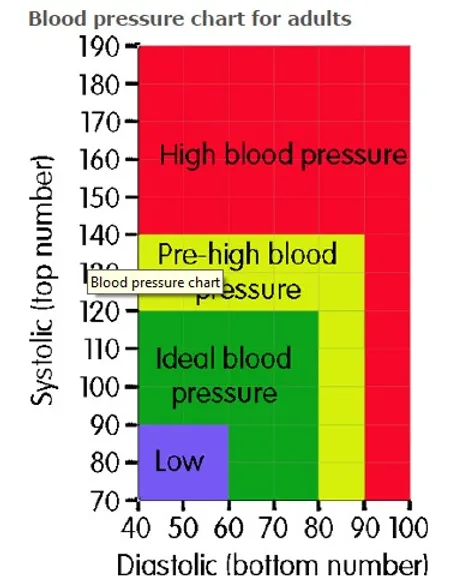 Use the NHS interactive blood pressure chart below by entering your two blood pressure readings, it will then: